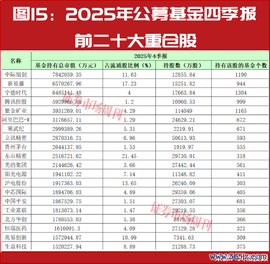 这直观地体现在新鲜出炉的四季度十大重仓股上。天相投顾报告显示,内地公募基金最新前十大重仓股分别为中际旭创、新易盛、宁德时代、腾讯控股、紫金矿业、阿里巴巴-W、寒武纪-U、立讯精密、贵州茅台、东山精密。和2025年三季度末相比,寒武纪-U、东山精密新进公募基金前十大重仓股,工业富联、中芯国际退出前十大重仓股。中际旭创成为公募基金2025年四季度增持市值最多的股票,增持市值为226.02亿元。此外,中际旭创已经连续三个季度成为公募基金增持市值最多的股票,其一举取代宁德时代成为公募基金头号重仓股。