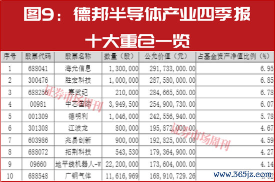 从最新披露的德邦半导体产业四季报来看,对比上一季度,一方面雷涛对上一季重仓中的海光信息、胜宏科技、寒武纪-U、中芯国际明显加仓,从而它们在最新的组合中排在了前四的位置;另一方面他本季新重仓了德明利、拓荆科技、地平线机器人、广钢气体等4只标的,它们在近三个月全部实现了上涨,尤其是广钢气体的涨幅已经突破了90%。