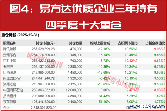 其在管A股基金中时间最长的是易方达蓝筹精选,四季报中十大重仓股的占比两极分化,其中前八位的重仓股占比均超过8%,而排在最后两位的重仓股占比只在5%一线。对比三季报来看,其组合的十大重仓股全部是上一季度的老面孔,腾讯控股虽被减持却蝉联了第一重仓股;此外,其组合中的四大白酒股均在四季度被小幅减持,唯一增仓的标的是阿里巴巴-W。
