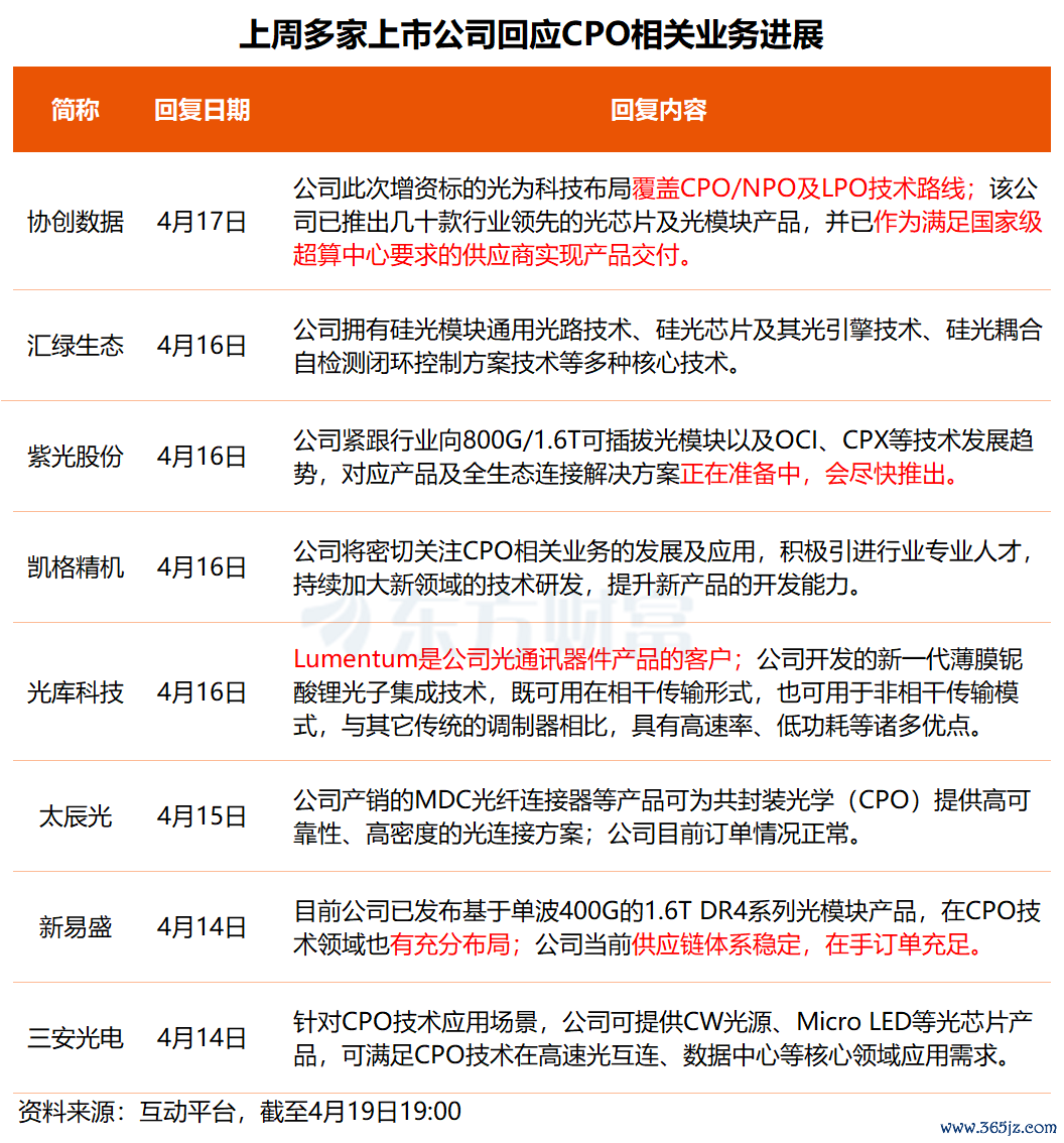 据不完全统计,上周有多家上市公司在互动平台对“CPO”相关提问进行了回复: